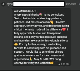 ALHAMDOLILLAH! A very special thanks💐 to Sarim bhai, Sarim bhai for his outstanding guidance, patience, and professionalism👏. His calm approach, timely advice, and dedication during critical moments made all the difference❤️ I truly appreciate his fair and transparent dealing, and I pray for his continued success and abundant rewards for his valuable efforts🤲. For my further journey, I am looking forward to continuing with his guidance and support. I would like to extend my sincere gratitude to everyone for their prayers and appreciation🙏. May ALLAH SWT bring Asaniya for everyone, Aameen🤲.